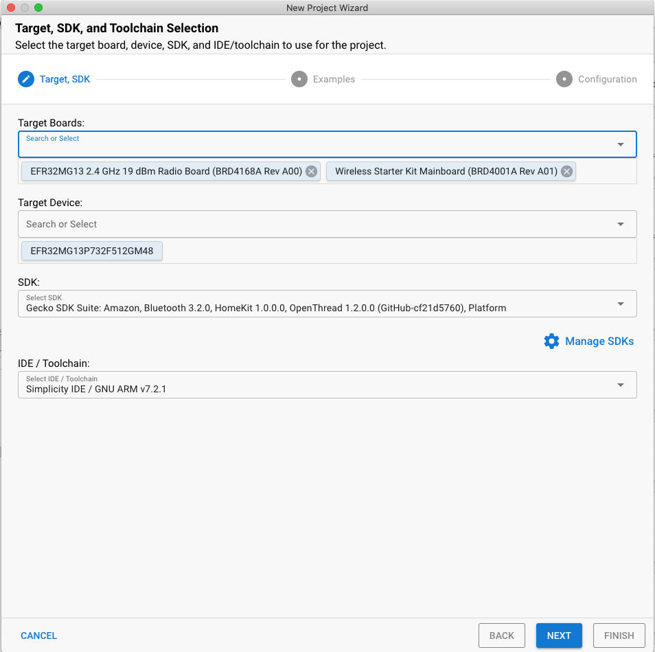 - 打开 Studio 的文件菜单,然后选择新建 >Silicon Labs 项目向导。系统随即会打开“目标、SDK 和工具链选择”对话框。不更改 OpenThread 支持的默认 Simplicity IDE / GNU 工具链。点击“下一步”。