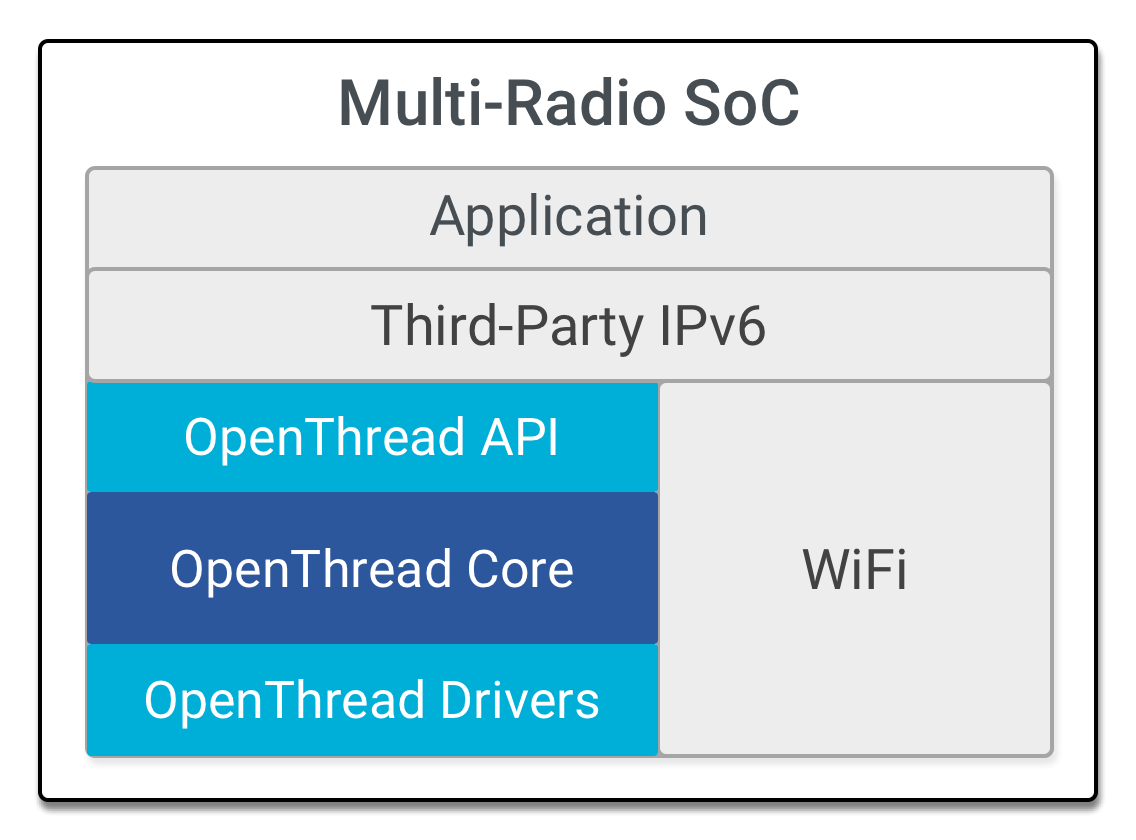 Jeśli układ SoC ma kilka odbiorników radiowych, np. 802.15.4, Wi-Fi lub 802.15.4 i Bluetooth Low Energy (BLE), warstwa aplikacji i OpenThread będą nadal działać na tym samym procesorze. W projektowaniu z wieloma interfejsami OpenThread korzysta ze wspólnego stosu IPv6 innej firmy za pomocą interfejsu datagramu IPv6.